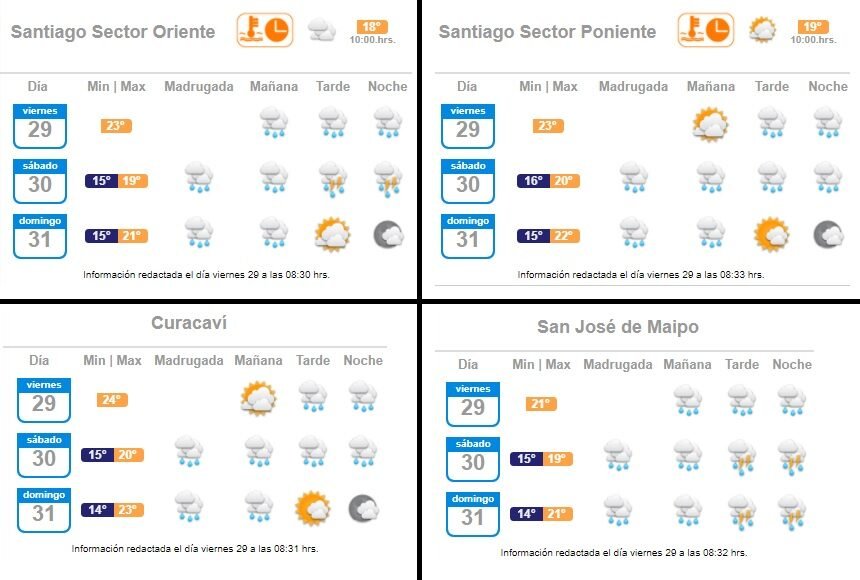 Zona Central: Se presentará con abundante nubosidad y precipitaciones de variada intensidad en todo el tramo, además se espera la probabilidad de tormentas eléctricas entre las regiones de Maule y Biobío, viento de hasta 40 km/h en las regiones de Ñuble y Biobío”.